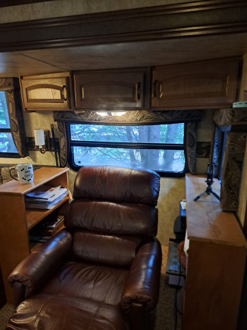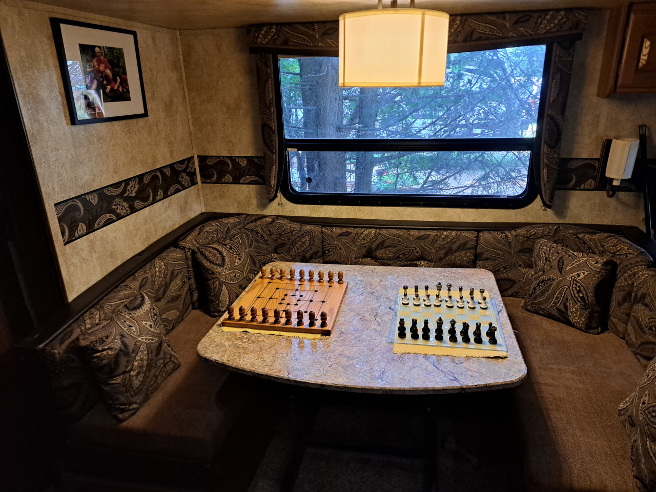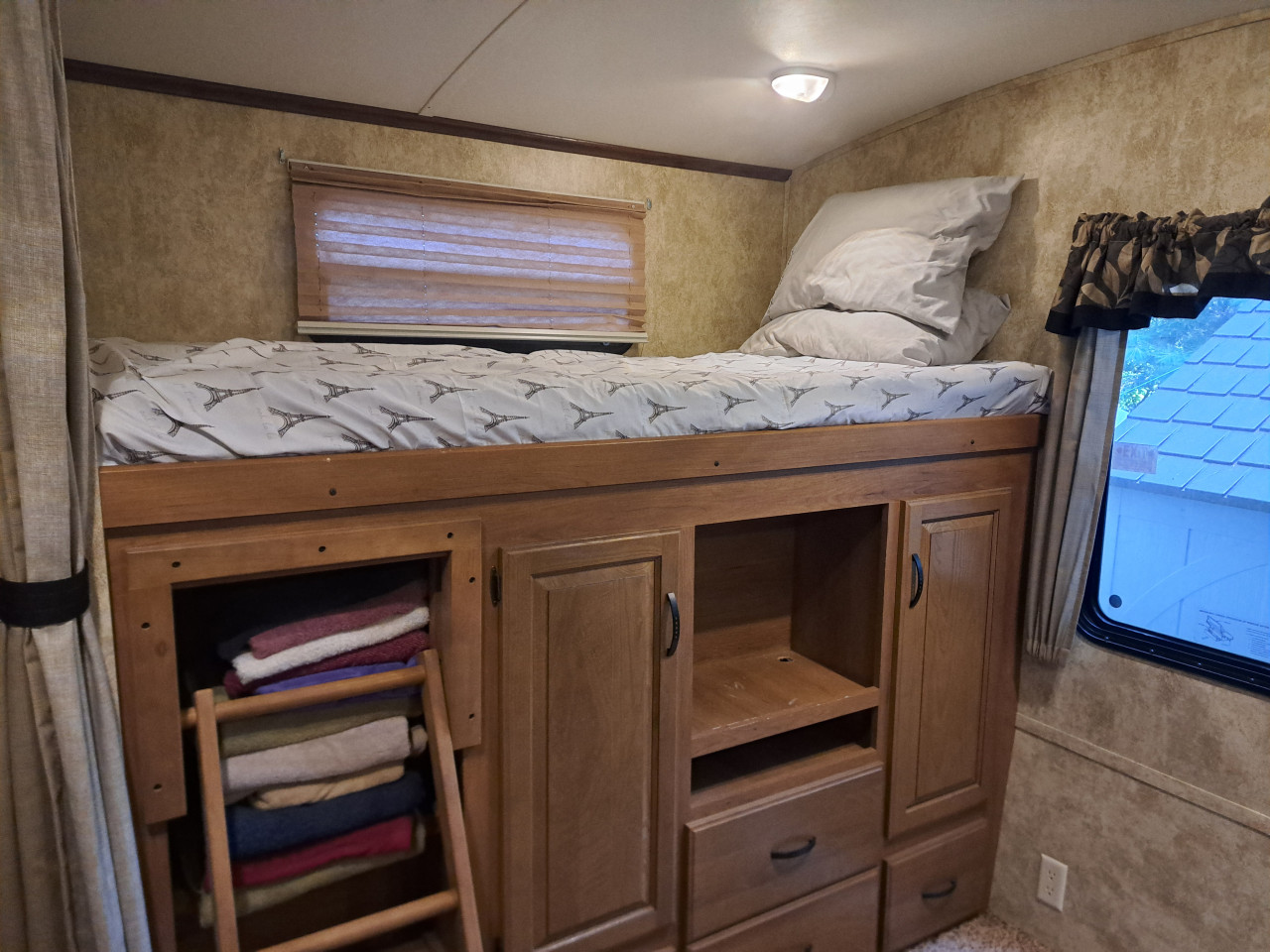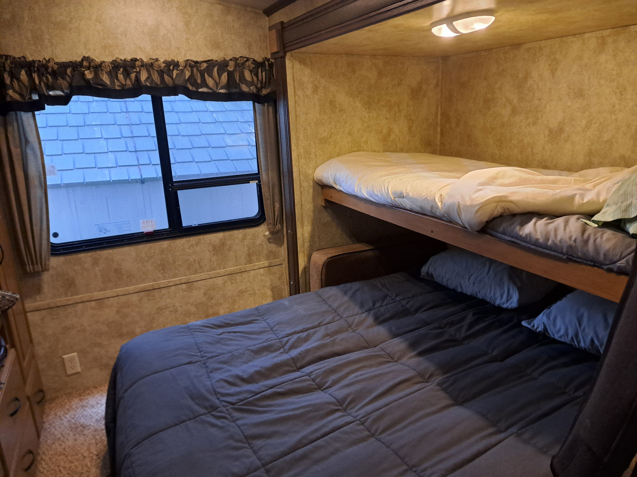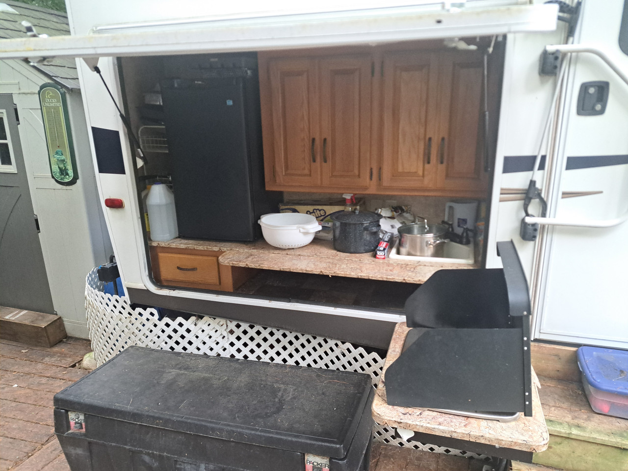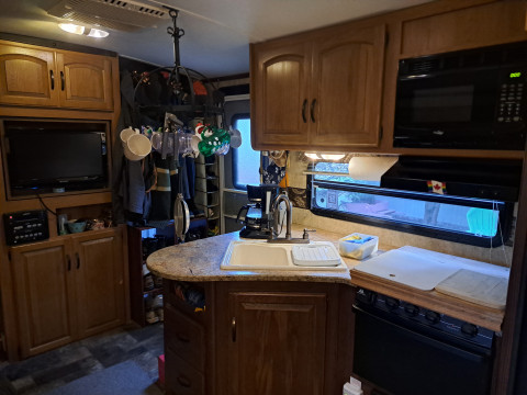 Trailer Includes: Sleeps 6, microwave, AC, shed, deck, outdoor kitchen, queen bed, pull out sofa, dinette seats 6, full size fridge, wood crib
